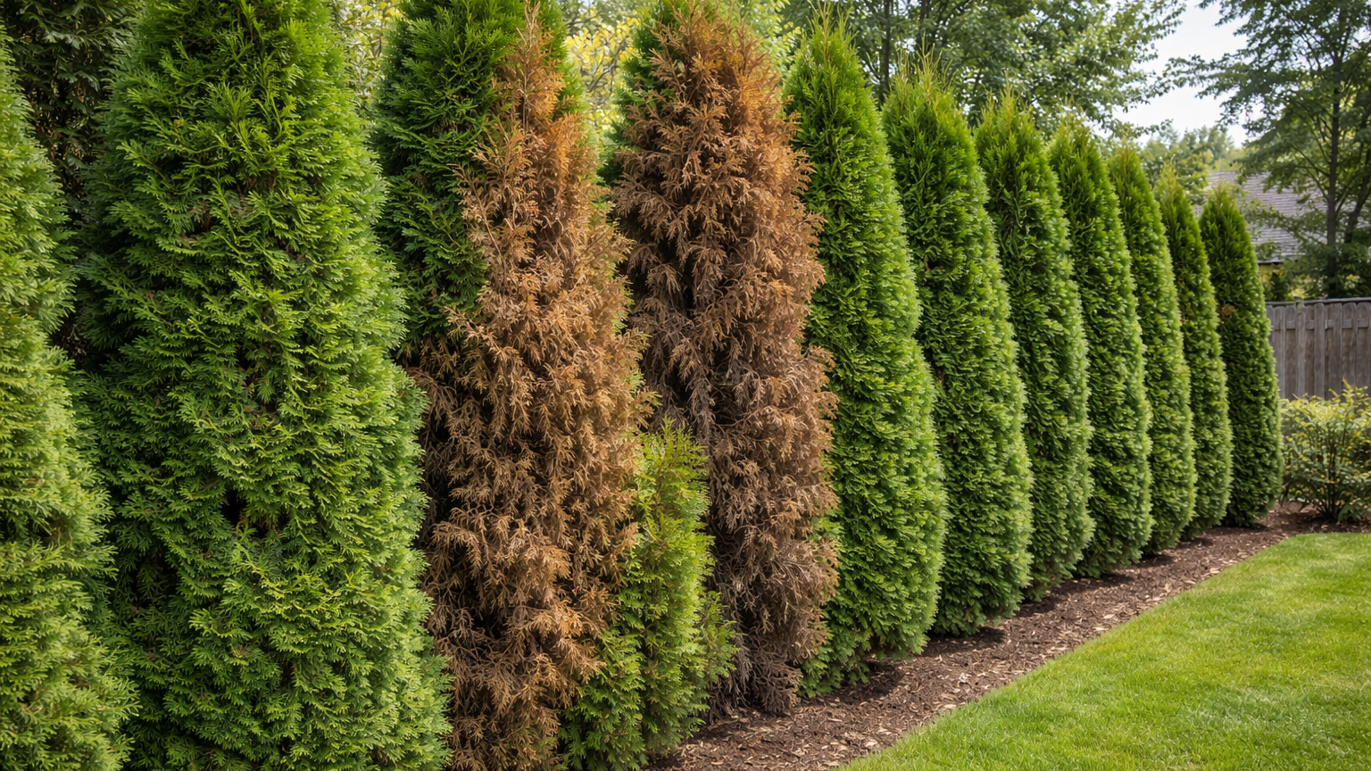 Arborvitae have moderately shallow roots and rely on consistent soil moisture. In hot, dry summers or during prolonged dry spells, insufficient water causes browning foliage, wilting, and dieback — usually starting at the tips and moving inward.(Biology Insights)
